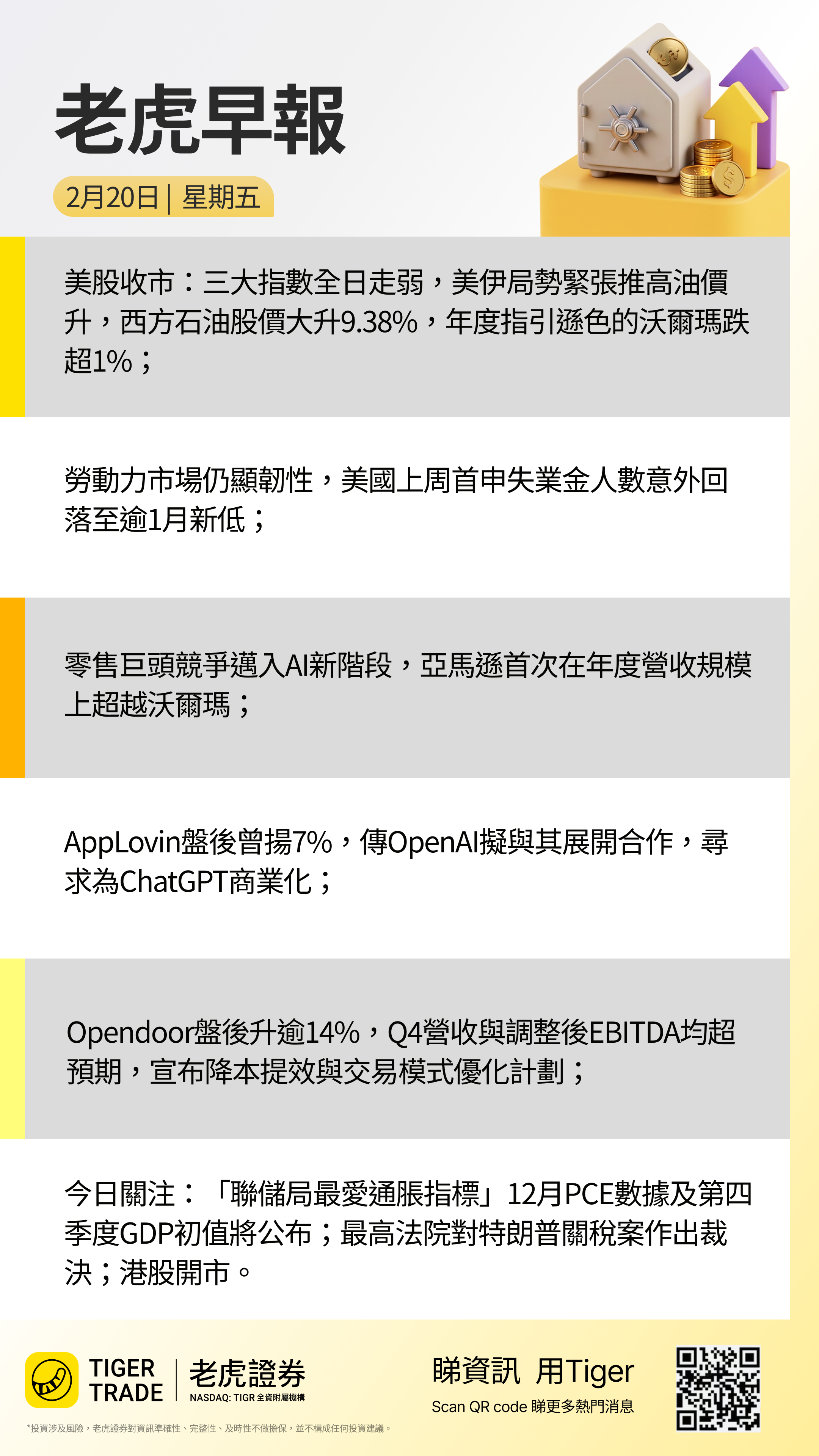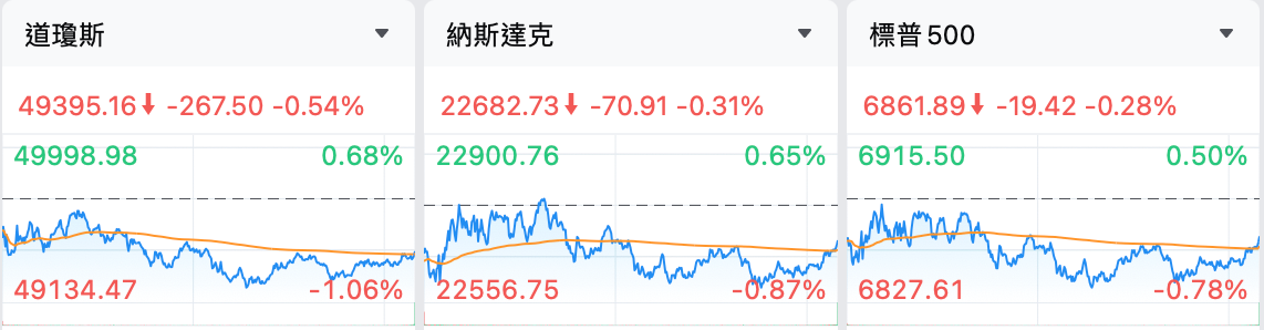 2月20日,美股三大指数收跌,道琼斯指数跌0.54%,报49395.16点;标普500指数跌0.28%,报6861.89点;纳斯达克综合指数跌0.31%,报22682.73点。