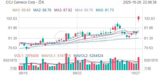 10月28日,美股核电股盘初走强,Cameco涨超20%,Uranium Energy 涨超9%,Energy Fuels涨超7%,Centrus Energy涨超4%,Oklo Inc涨近2%。