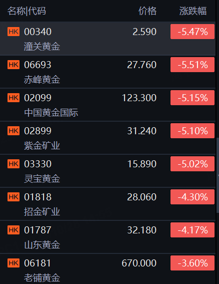 现货黄金日内跌幅扩大至1%!港股黄金股午后跌幅持续扩大