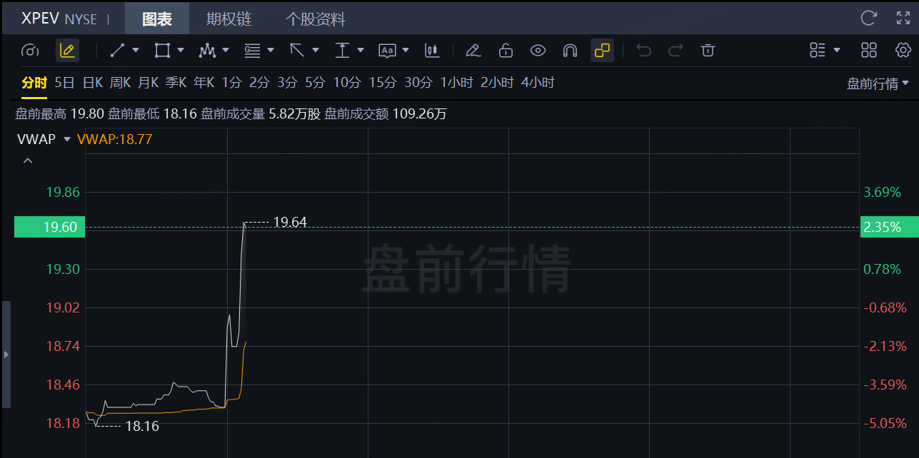 小鹏汽车盘前股价快速拉升,由跌转涨。