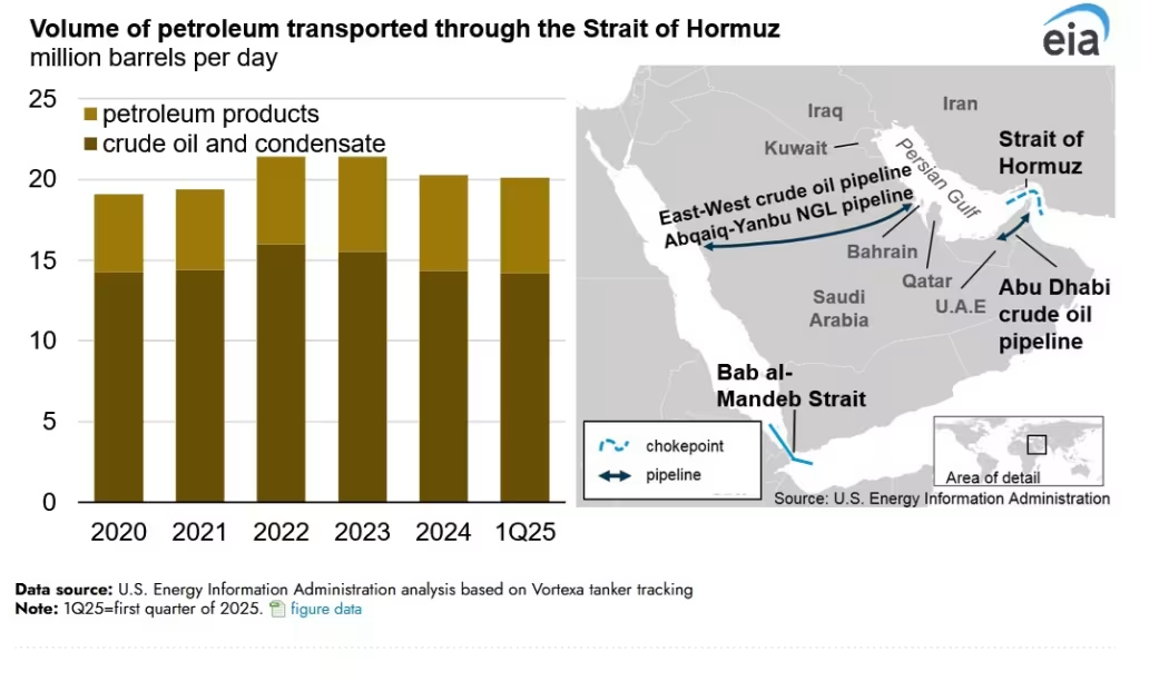 伊朗亦具备切断霍尔木兹海峡石油运输的能力。EIA 数据显示,2024 年每日经该海峡运输的石油约 2,000 万桶,占全球石油液体消费量约 20%。