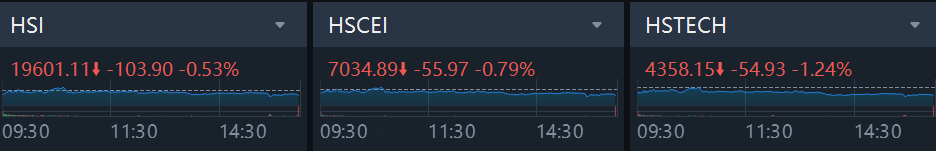 Hong Kong stock market closed lower on Thursday. The Hang Seng Index (HSI) fell by 0.53%, the Hang Seng China Enterprises Index (HSCEI) dropped by 0.79%, the Hang Seng Tech Index (HSTECH) decreased by 1.24%, and the Hang Seng China-Affiliated Corporations Index (HSCCI) declined by 0.39%.