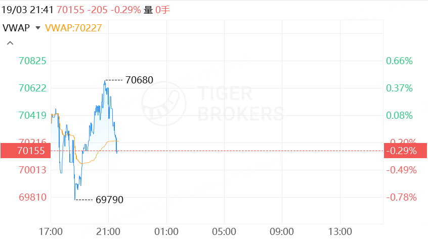 Tiger Trade行情显示,BTC跌至70155美元,24H跌幅0.29%;ETH升至2145美元,日内升幅1.2%。