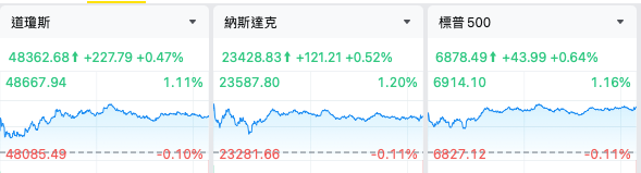 周一,美股高开高收,三大指数均连涨三日。截至收盘,道琼斯指数涨0.47%,报48362.68点;标普500指数涨0.64%,报6878.49点;纳斯达克综合指数涨0.52%,报23428.83点。
