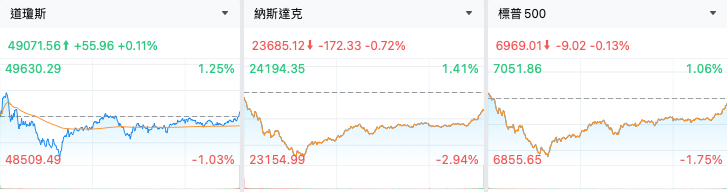 周四(1月29日),美股三大指数涨跌不一。截至收盘,标普500指数跌0.13%,报6969.01点;纳斯达克综合指数跌0.72%,报23685.12点;道琼斯指数涨0.11%,报49071.56点。