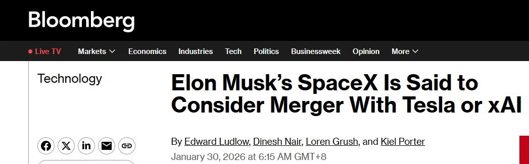 据报道,知情人士称,SpaceX正在考虑与特斯拉潜在合并,同时也在评估与人工智能公司xAI的整合方案。知情人士透露,该公司已探讨过SpaceX与特斯拉合并的可行性,一些投资者正在推动这一想法。另有部分知情人士称,他们还在探索在首次公开募股(IPO)之前SpaceX与xAI合并的可能性。知情人士透露,任何交易都可能吸引基础设施基金和中东主权投资者的浓厚兴趣。其中一位知情人士还表示,相关交易也可能需要配套的大规模融资。