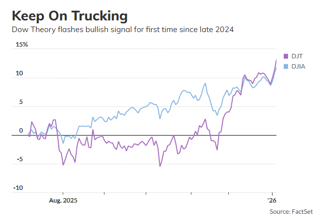 这是一年多以来,道氏理论首次在周二发出买入信号,当天道琼斯工业平均指数(DJIA)和道琼斯运输平均指数(DJT)同时创下历史收盘新高。