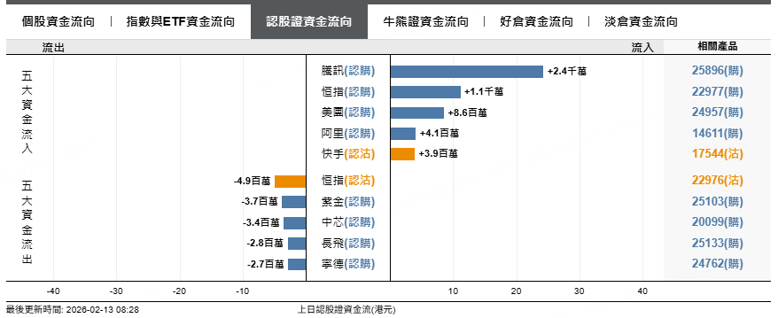 恒指熊證上日流出4600萬元,藥明牛證上日流出190萬元,匯豐牛證流出180萬元。