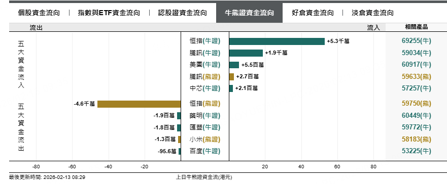 恒指牛證上日流入5300萬元,騰訊牛証流入1900萬元,美團牛證流入550萬元。