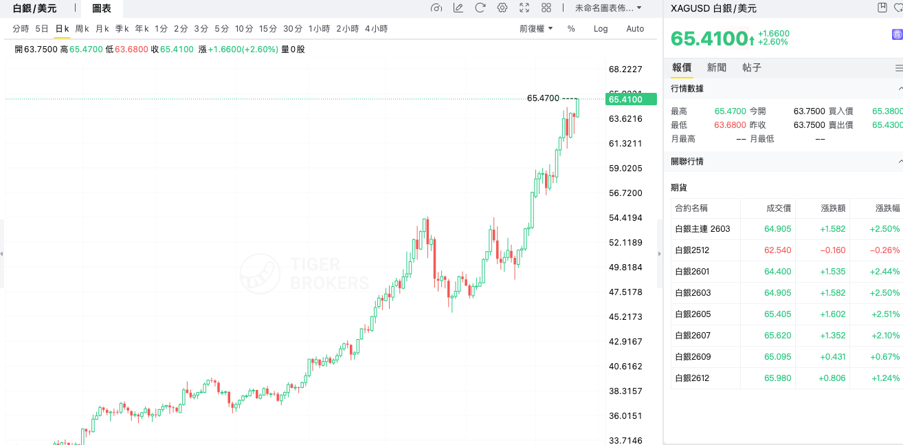 现货白银站上65美元/盎司,为历史首次,日内涨2.10%。