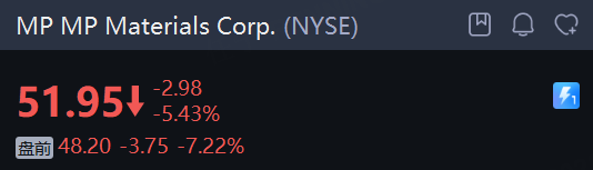 MP Materials Corp. 跌超7%。公司Q3营收为5355万美元,同比下降15%,略低于分析师预期的5492万美元。季度亏损达4180万美元,而去年同期亏损为1120万美元。剔除一次性项目后每股亏损10美分,分析师预期为每股亏损18美分。