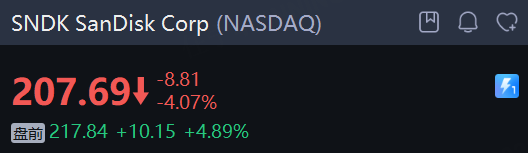 SanDisk Corp 涨近5%。2026财年第一财季,公司总营收同比增长23%至23.1亿美元,超过分析师预期的21亿美元。调整后每股收益为1.22美元,远高于分析师预期的0.89美元;营业利润环比激增878%至1.76亿美元。公司预计第二财季营收将达到25.5亿至26.5亿美元之间,高于华尔街平均预期的23.6亿美元。公司高管表示,NAND闪存市场供不应求的局面预计将持续到2026年底。