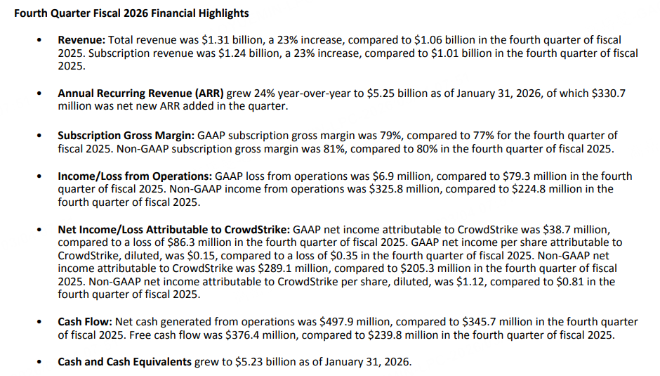 美国网络安全公司 CrowdStrike Holdings, Inc. 公布2026财年Q4业绩,财报显示,公司在企业云化转型和AI安全需求带动下延续较快增长,同时给出高于市场预期的2027财年收入指引。不过,去年7月Windows大规模宕机事件带来的相关成本仍在扩大,对利润形成一定拖累。