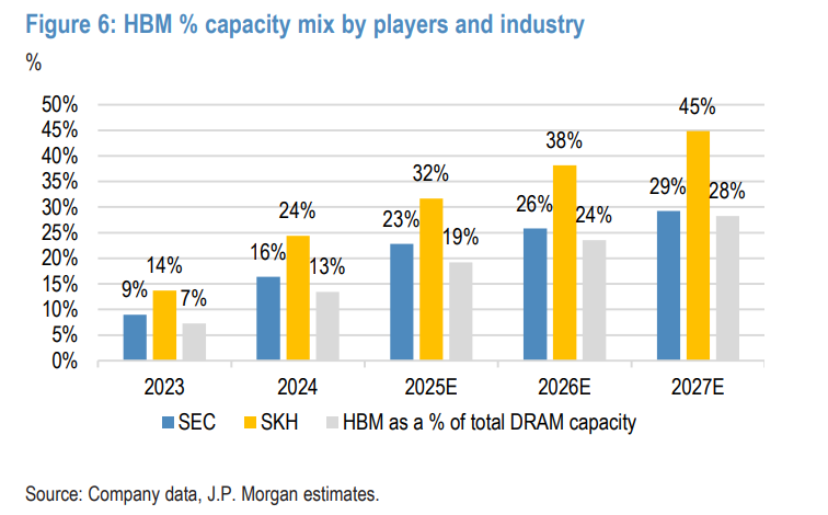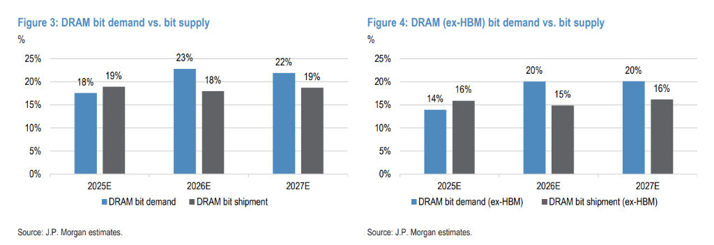 持续短缺:摩根大通预计HBM的供需短缺(约8%-12%的缺口)将贯穿2027年,甚至可能延续至2028年。