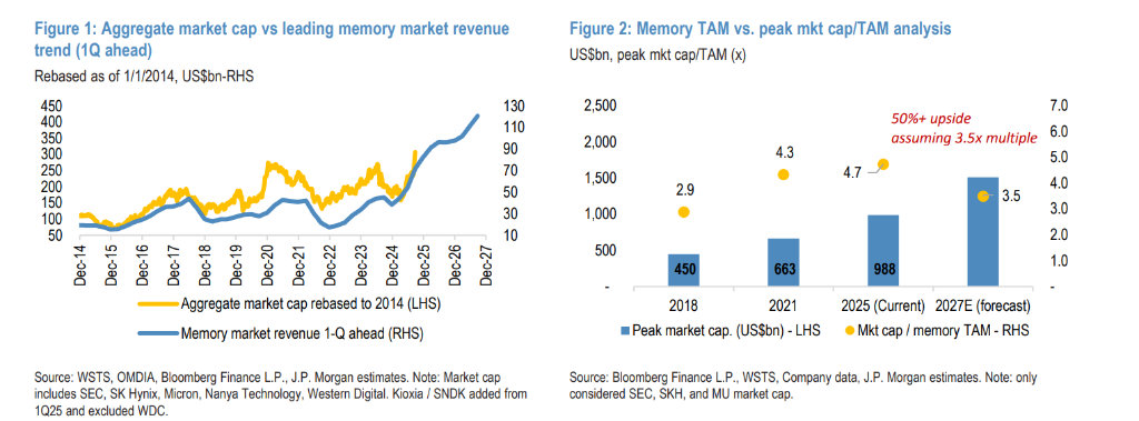 摩根大通在最新研报中指出,当前头部存储芯片制造商的总市值已接近1万亿美元。基于历史估值中枢推算,到2027年这一数字将飙升至1.5万亿美元,意味着头部厂商仍有超过50%的上涨空间。