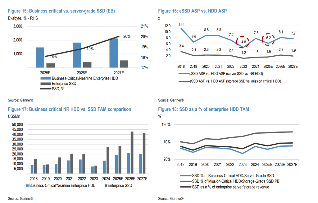 由于HDD(机械硬盘)厂商在2026年的资本开支指引谨慎,摩根大通预计eSSD将在未来6个月享受巨大的需求顺风,推动2026财年NAND价格上涨27%。