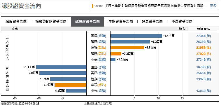 恒指熊證上日流入7700萬元,美團熊證流入500萬元,納指牛證流入270萬元。