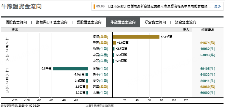 恒指牛證上日流出5800萬元,快手牛證上日流出390萬元,港交牛證流出340萬元。