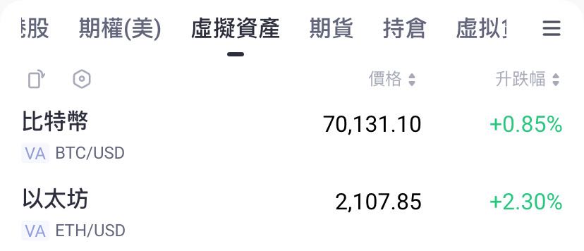 据Tiger Trade行情,BTC 24小时内升0.85%,报70131.1美元;ETH 24小时内升2.30%,报2107.85美元。
