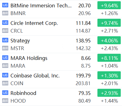 加密货币概念股盘前普涨,Coinbase、Circle、Strategy涨超2%,Robinhood、BitMine Immersion等跟涨。