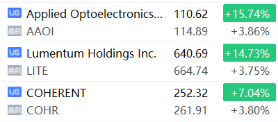 美股光通信股盘前续涨,Coherent、Lumentum、Applied Optoelectronics均涨近4%;