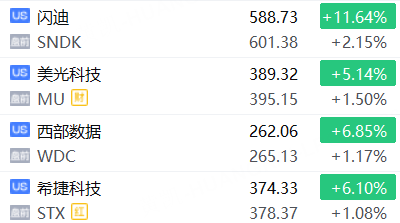存储概念股上涨,闪迪涨超2%,美光科技、西部数据、希捷科技涨超1%。