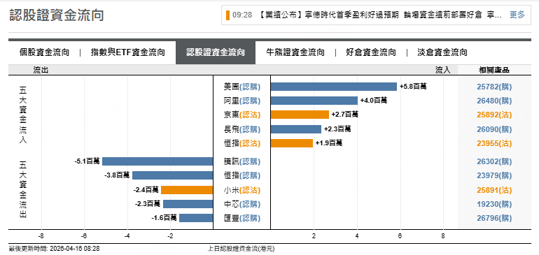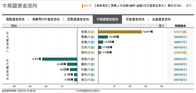 恒指熊證上日流入2800萬元,美團牛證流入600萬元,泡瑪牛證流入300萬元。
