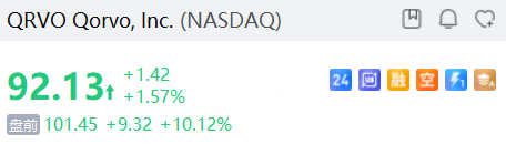射频芯片企业Qorvo盘前涨超10%,据报道称,苹果供应商Skyworks据悉洽谈以80亿美元的价格收购该公司。