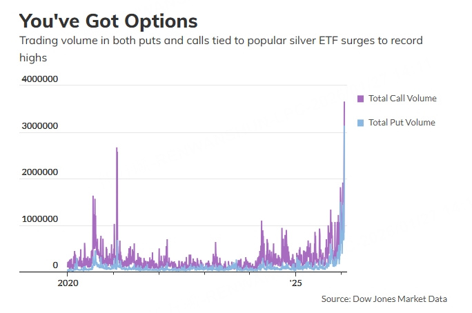 FactSet 数据显示,自2025年1月1日以来,白银期货在连续合约口径下累计上涨了230%。与此同时,热门白银ETF以及与这些ETF挂钩的期权合约,其交易量在周一飙升至历史最高水平。