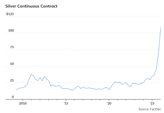 白银期货周一大涨14%,创下自1985年3月19日以来的最佳单日表现;自2025年1月1日以来累计涨幅已达230%。