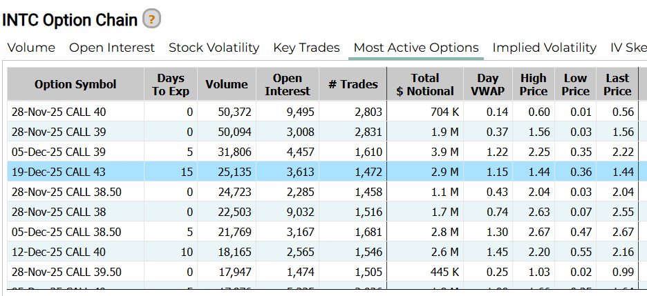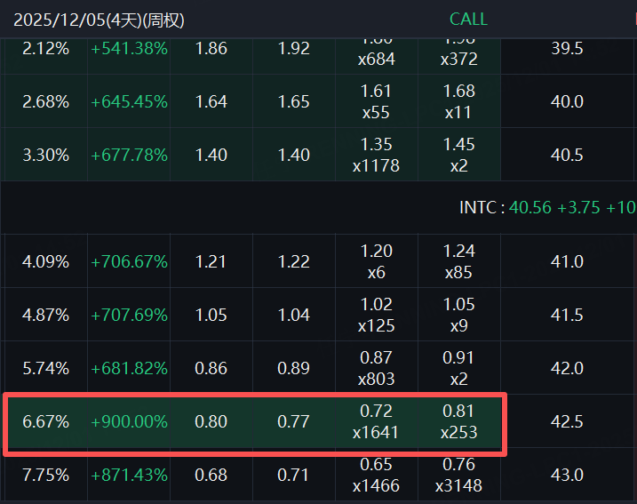 英特尔的CALL成交价格随行情飙升,一份本周五(12月5日)到期,行权价42.5美元的合约,成交价暴涨900%!