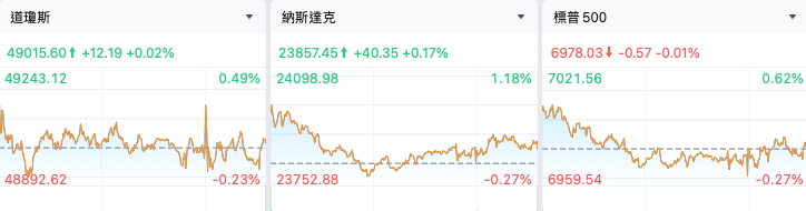 周三(1月28日),美股三大指数涨跌不一。截至收盘,道琼斯指数涨0.02%,报49015.60点;纳斯达克综合指数涨0.17%,报23857.45点。标普500指数跌0.01%,报6978.03点,早盘一度升破7000点大关,最高报7002.28点,创下盘中纪录。