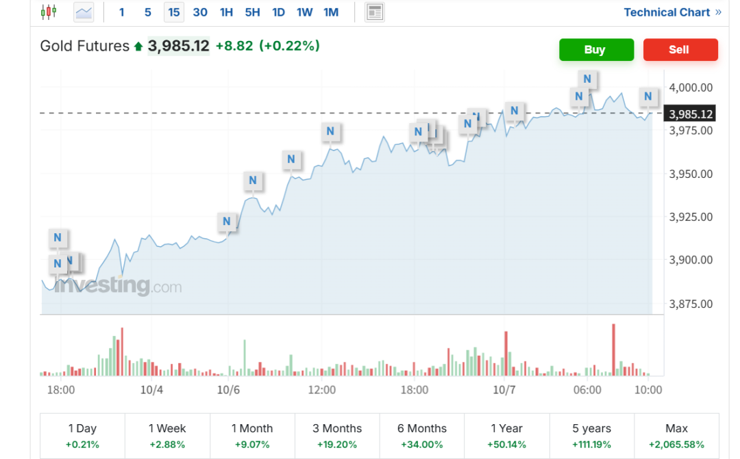 10月7日,亚太市场早盘,纽约期金涨至4000美元/盎司整数位心理关口,创历史新高。随后,金价有所回落,但仍在高位震荡。