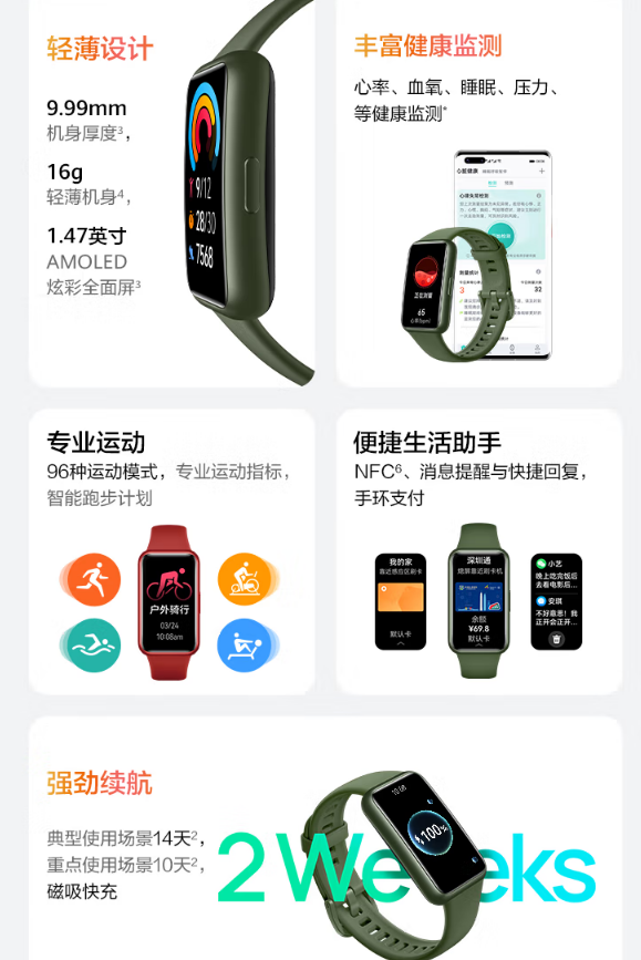 常用功能全覆盖!华为手环7提供了多达96种专业运动模式适配,多达8000+风格迥异的表盘,加上AMOLED大屏带来的优势,使其支持待机表盘功能,息屏后也可随时查看时间!9.99mm超薄机身+低至16g的超轻机身重量令其日用佩戴近乎无感,轻盈舒适!支持磁吸快充,充电5分钟也能续航两天。典型使用场景续航长达两周,出差忘记带充电器也无所畏惧!
