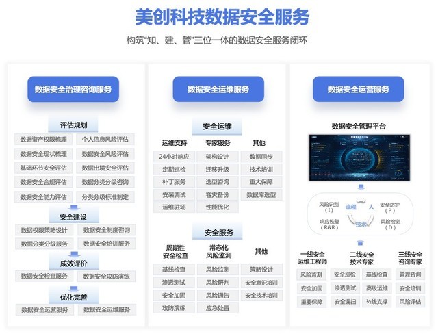 长期专注于数据安全,美创积极探索数据安全服务市场,并形成完善的数据安全服务体系,包括:数据安全治理咨询服务、数据安全运维服务、数据安全运营服务,从“知、建、管”三方面,实现从咨询到规划,再到持续安全运营的闭环,充分满足用户在数据安全建设不同阶段的安全服务诉求。