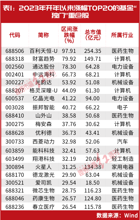 据Wind统计,截至2022年第四季度末,共有641只个股(未包括港股)有幸成为了基金的“独门”重仓股,其中有555只个股的股价在2023年开年以来(至1月30日收盘,下同)实现了大涨,占比86.58%。其中,新股百利天恒涨幅最高为97.91%,财富趋势、通达股份、中远海科和光韵达等同样涨幅居前(见表1)。