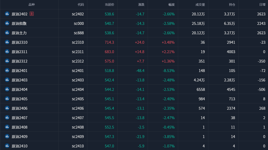 截至1月3日15点收盘,今日SC原油期货合约大多数下跌。其中主力合约SC2402收盘价538.6元/桶,跌幅2.66%。持仓3.27万手,日增2623手。
