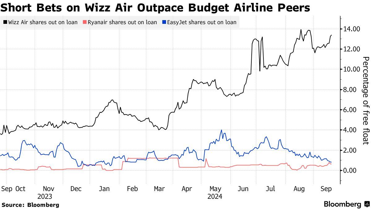 智通财经APP获悉,随着消费者削减支出、旅游业前景趋弱,空头正押注廉价航空公司Wizz Air Holdings(WZZAF.US)的境况将比其欧洲同行更糟糕。标普全球市场情报公司的最新数据显示,Wizz Air Holdings的流通股中有13%被做空,相比之下,其竞争对手易捷航空(ESYJY.US)和瑞安航空(RYAAY.US)的流通股中被做空的占比均不到1%。