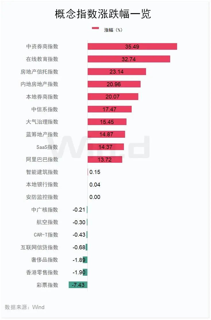 数据来源:Wind从盘面来看,Wind概念板块多数上涨,中资券商指数涨35.49%,在线教育指数涨32.74%,房地产信托指数涨23.14%。跌幅方面,彩票指数领跌7.43%,香港零售指数跌1.9%,奢侈品指数跌1.89%。