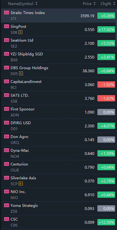 SingPost rose 17%, Seatrium rose 5.5%, YZJ Shipbldg rose 2.4%, DBS rose 0.8%, SATS fell 1.8%.