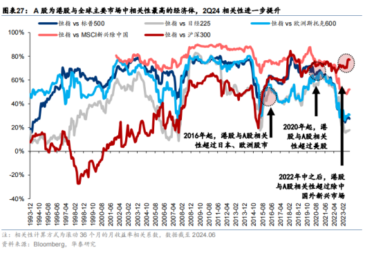对比A股走势来看,港股市场在过往一直有着“熊短牛长”的特征,市场的国际化和机构化程度决定市场的成熟度更高,长期视角的趋势上行更加明显,但随着两地市场的互联互通,A股和港股关联度也快速抬升,两者的特征也在逐渐接近,二者的市场特征也有望趋同。只是从2021年后的趋势来看,更多是港股向A股的趋势靠拢。