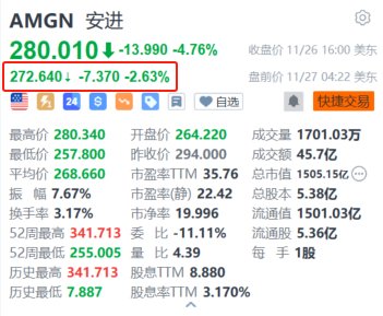 美股异动|安进盘前续跌超2.6% 公布减肥药试验效果与礼来Zepbound相当但副作用较大