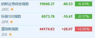 美股三大指数涨跌不一,纳指跌0.43%,标普500指数跌0.17%,道指涨0.06%。