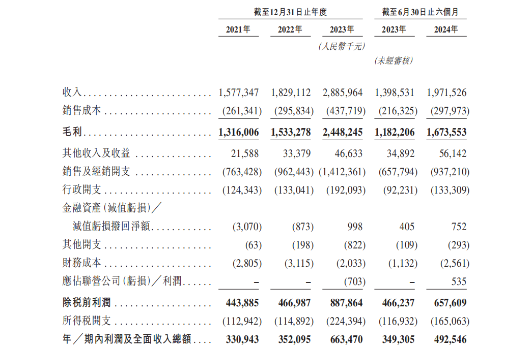 从毛戈平股份的业绩表现来看,其总营收和净利润均实现连年较大幅度的增长。公司总营收从2021年的15.77亿元增至2023年的28.86亿元,复合年增长率为35.3%;净利润从2021年的3.31亿元增至2023年的6.63亿元,复合年增长率为41.6%。