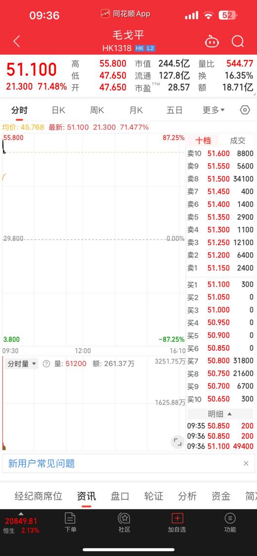 毛戈平股份作为新股上市,自然获得了较高估值和较高的投资吸引力。上市首日,截至12月10日9点36分,毛戈平股价报51.1港元/股,市值高达244.5亿港币。