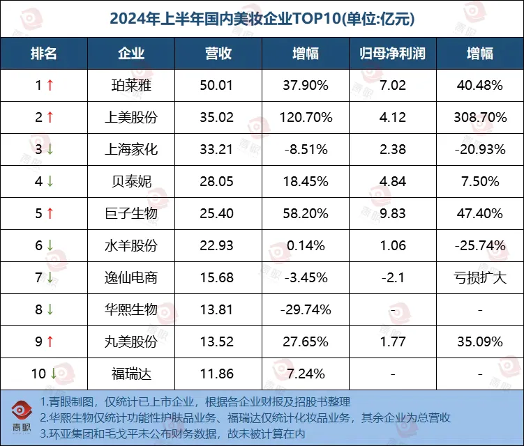 对于投资者而言,盈利能力至关重要。据青眼统计,2024上半年国内美妆企业TOP10企业中,上美股份营收为35.02亿和净利润为4.12亿元,增幅均排国内美妆企业第一。且营收超过了老牌企业上海家化,以及功效护肤领域代表企业贝泰妮,跃居TOP2,成为当之无愧的黑马选手,展现较强的增长实力。
