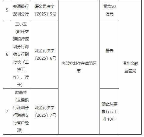 内部控制存在薄弱环节!交通银行深圳分行被罚50万元 一客户经理被禁业10年