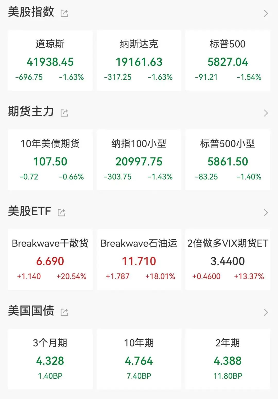 道琼斯工业股票平均价格指数下跌696.75点,至41,938.45点,跌幅1.63%。标准普尔500指数下跌1.54%,至5,827.04点,纳斯达克综合指数下跌1.63%,至19,161.63点。
