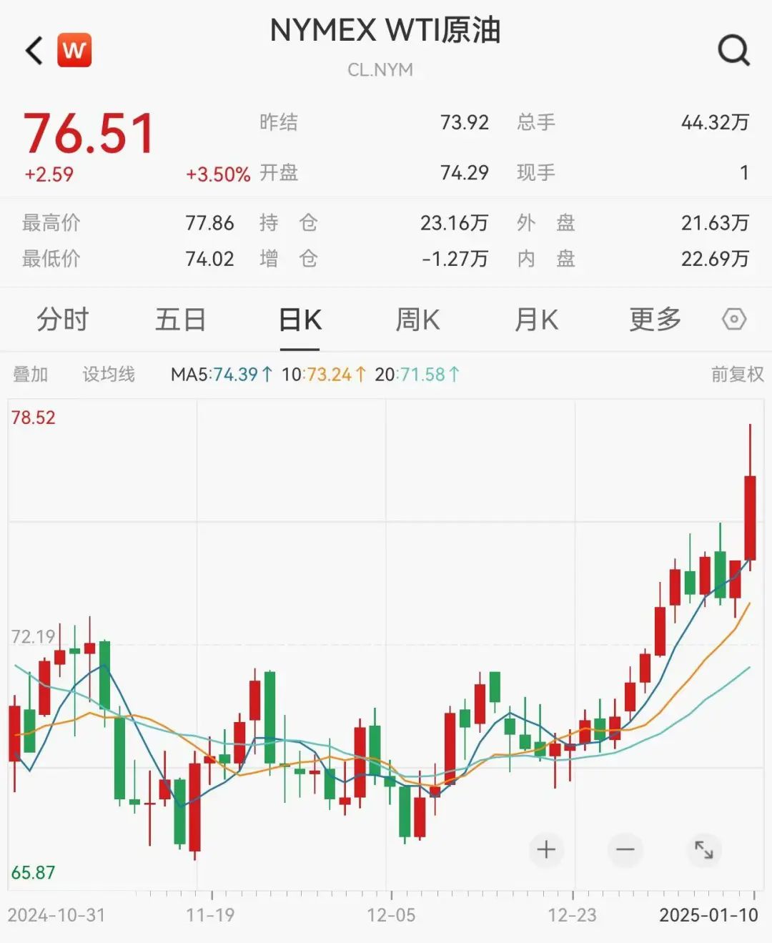 NYMEX WTI原油价格报76.51美元/桶,单日上涨2.59美元,涨幅达3.50%。盘中最高触及77.86美元,最低下探至74.02美元。日K线显示,油价连续多日上涨,突破关键均线阻力,呈现出强劲的上升趋势。