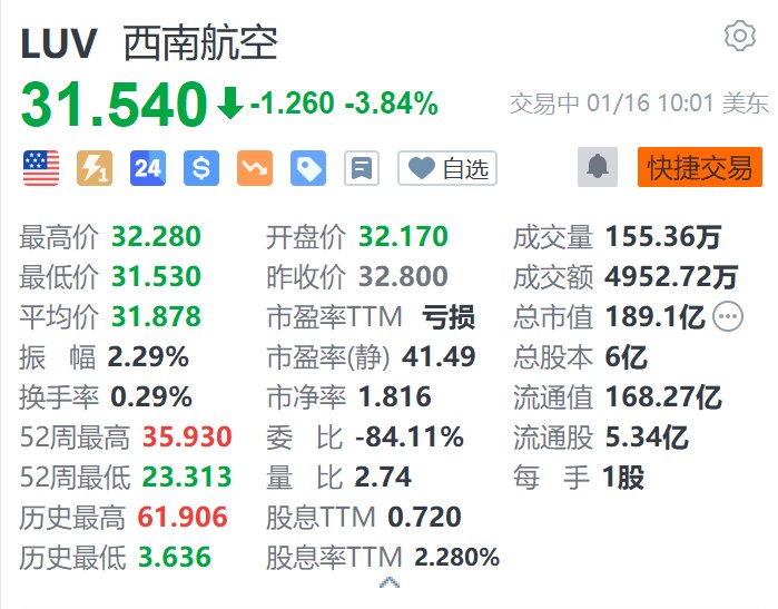 格隆汇1月16日|西南航空(LUV.US)跌超3.8%,报31.54美元。消息面上,美国运输部起诉西南航空,指其涉嫌违反要求航空公司制定并满足实际的航班时刻表的规定。该机构周三在一份声明中表示,该航空公司应为扰乱乘客出行计划的“长期、非法的航班延误”负责。美国运输部在加州奥克兰联邦法院提起的诉讼中表示,将寻求对西南航空处以最高民事处罚。(格隆汇)